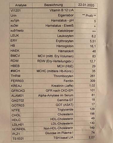 Blutwerte von K4S4 » 30 Mai 16 2343 Hi Leute, hab in den letzten Jahren beobachten können, dass mein Kalorienverbrauch und die Libido langsam runter geht und bin mir sicher, dass es nicht am Training und der Ernährung liegen kann, das stimmt beides soweit, hab auch keine extremen Diäten durchgezogen oder so. BMCV 91 BTHROM 321 MDRD SKREA 0,76 BHK 47* SGOT 33 SHRST 27 BERY 5,1* C3 1,38 C4 0,35 Und 6 Wochen später nach nochmaliger Blutabgabe HLAB27 0 HLA pos* SCK 24 SLDH 134 Ich weiß weder wofür die Abkürzungen stehen noch welche Werte „normal“ sind Ich bin also um jede helfende Antwort dankbar. BMCV fl 78 81 HAEK % 3646 41 #MCH g/dl 3036 35 HBEB pg 2632 28 EISE01 µg/dl 59 BLZS01 mg/dl 76.