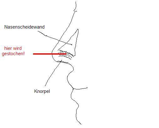 Suchen Sie sich einen guten und erfahrenen Piercer Er wird versuchen, das Piercing unterhalb der Knorpel zu stechen Dort ist nur eine dünne Haut und das Stechen ist nicht so schmerzhaft Wird das Piercing durch das Knorpelgewebe gestochen, werden Sie das als sehr schmerzhaft empfinden. Erwischt er den Knorpel, kann die Prozedur schon ziemlich fies werden Lass also nur einen erfahrenen Piercer ran, der auch vorher checkt, ob die Anatomie deiner Nase ein gerade gestochenes SeptumPiercing möglich macht (und dir ganz ehrlich sagt, ob es dir und. Natürlich sollte der Piercer hierfür auch ordentlich durch die Haut stechen;.